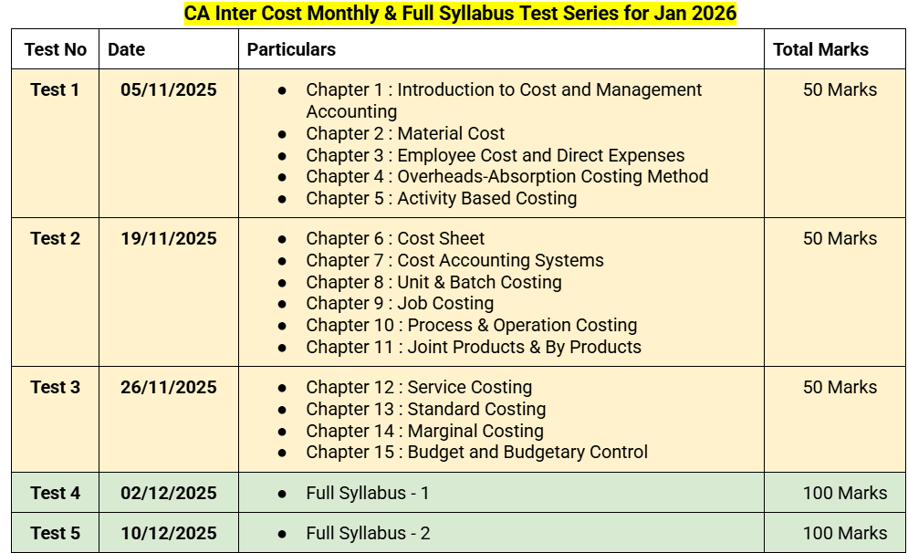 CA Inter Costing 3 Monthly & 2 Full Syllabus Test For January 2026